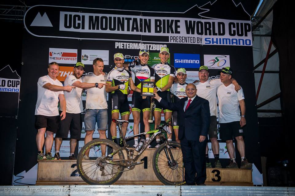 PIETERMARITZBURG – Rudi van Houts is het wereldbekerseizoen begonnen met een prima plek in de top 20. De renner uit Luyksgestel werd zondag in Pietermaritzburg 18e. Daarnaast schreef Van Houts met zijn teamgenoten van Multivan-Merida (Ondrej Cink, Thomas Litscher en José Hermida) het teamklassement op zijn naam. “Ik ben zeker tevreden met het resultaat en vooral ook met het snelle herstel van mijn blessure”, zei Van Houts, die tijdens de Cape Epic moest opgeven met een bovenbeenblessure die hij opliep bij een valpartij.