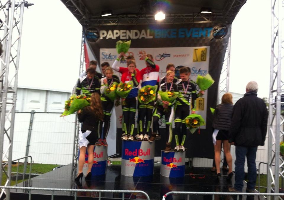 PAPENDAL – Afgaande op de deelnemerslijst wist je het al: de kans is groot dat Merida-Bassa – zij schreven maar liefst vier teams in – het NK Teamrelay gaat winnen. En zo geschiedde. Wat heet: de mannen en vrouwen van Patrick en Jan Bassa bezette in het smalle startveld de eerste vier plekken op het podium. Verrassend genoeg was het Merida-Bassa Team 4 (Peter Branderhorst, Julia Boschker, Dave van der Kooi en Dennis Ebert) dat won, daarbij profiterend van een slippertje van Maikel Govaarts van Team 1. Hij werd met zijn teamgenoten Rens de Bruijn, Manon van Hees en Carlo van den Berg wel tweede. De derde plek was voor Merida-Bassa 2 (Mark den Breejen, Natasja Nieuwehuizen, Pim van de Marel en Marvin Bovendorp).