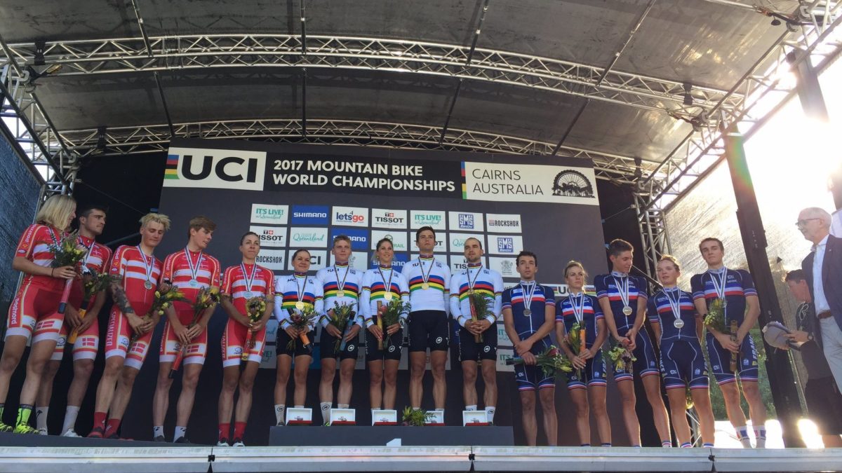 De eerste gouden medaille op het WK mountainbike in het Australische Cairns is woensdag naar Zwitserland gegaan. Het vijftal – voor het eerst werd in de Team Relay met twee vrouwen gereden – bleef in de estafette Denemarken en Frankrijk krap een halve minuut voor.
