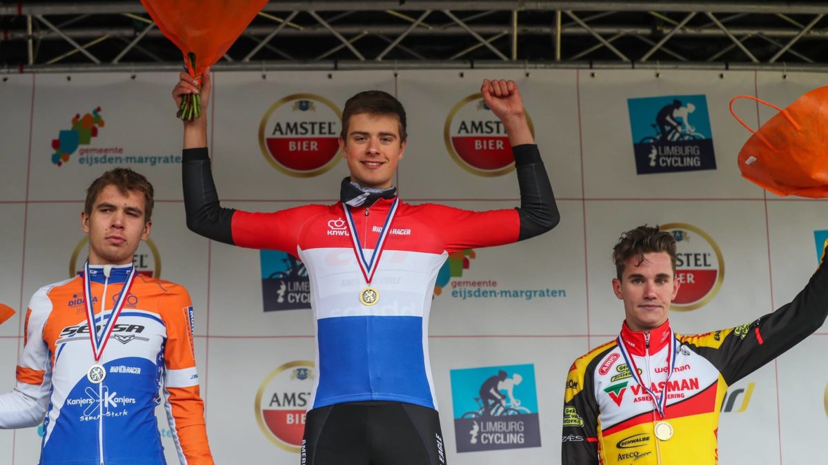 Tijdens de Bart Brentjens Challenge was hij niet altijd aan het genieten van daar waar hij mee bezig was: 115 kilometer koersen door de meest heftige omstandigheden. Maar nadat David Nordemann zich zondag in Eijsden verzekerde van zijn tweede Nederlandse beloftetitel van dit jaar en alles achter de rug is, is er plaats voor heel veel blijdschap. “Deze wedstrijd zo rijden was een hele mooie ervaring”, zegt de 20-jarige coureur van CST-Sandd, die op het podium werd vergezeld door Wiebe Scholten en Kelvin van den Dool. “En de dubbel pakken is natuurlijk supermooi.”