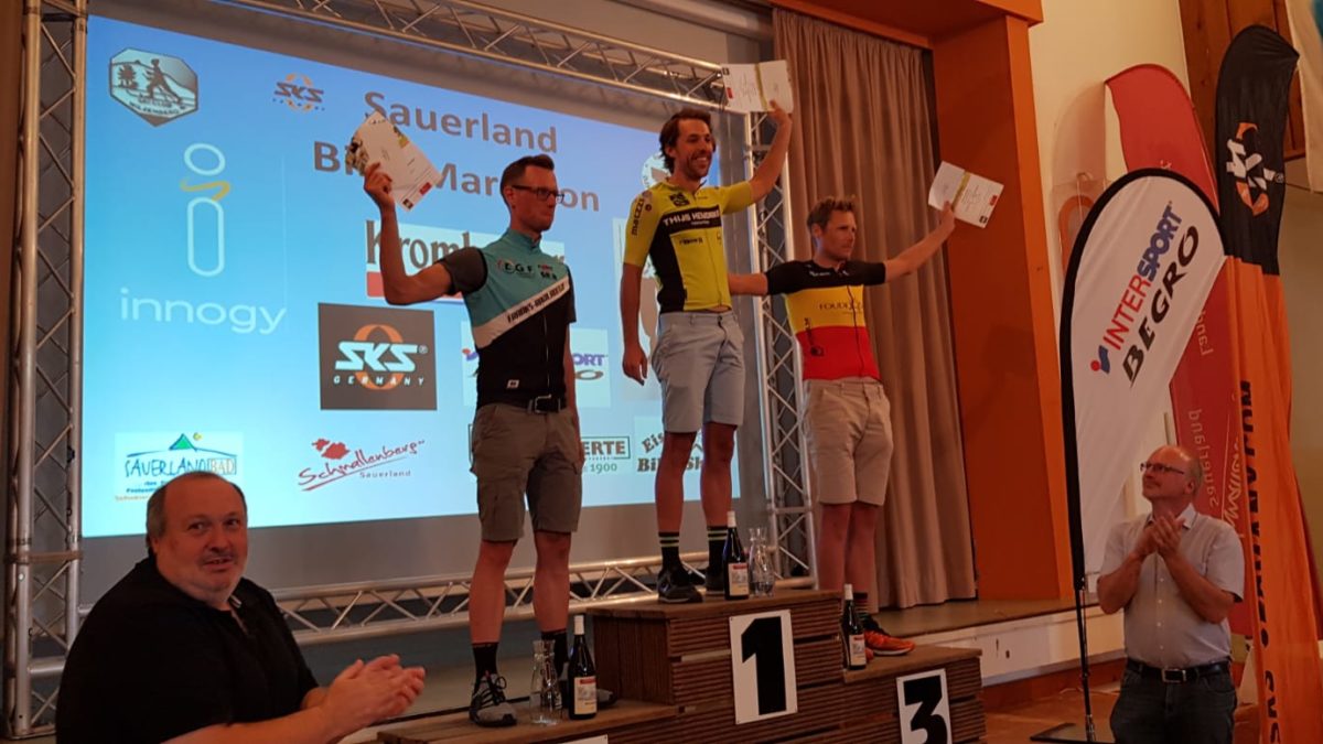 Ad’s fietscarrière staat nu op een lager pitje, maar de Sauerland Marathon is samen met zijn (schoon)familie nog steeds vaste prik. Nadat Ad (die in zijn leeftijdsklasse derde werd) in afwachting op het podium zijn mooie verhaal over zijn nachtmerrie had verteld, gaf hij me ook wat informatie over zijn eerdere prestaties in Grafschaft. Derde is ook zijn beste resultaat, nota bene op vrijwel dezelfde leeftijd (34) als dat ik nu heb.