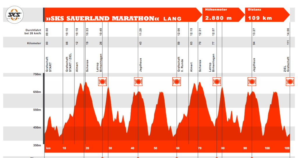 Het parcours is 109 kilometer lang en heeft 2900 hoogtemeters over twee ronden en is het prototype ‘Sauerland-marathon’. Schotter, nul technisch. Het mooie van deze koers zit ‘m in de beklimmingen: fijn percentage, allemaal ongeveer 250 hoogtemeters per stuk (4 per ronde). Je kunt er een heerlijke cadans vinden, en je krijgt de kans te herstellen in de retesnelle afdalingen.